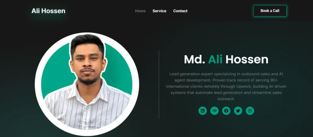 Designed to convert visitors into clients, this sleek personal website highlights lead generation expertise, AI-driven services, and outbound sales skills with a compelling content flow.