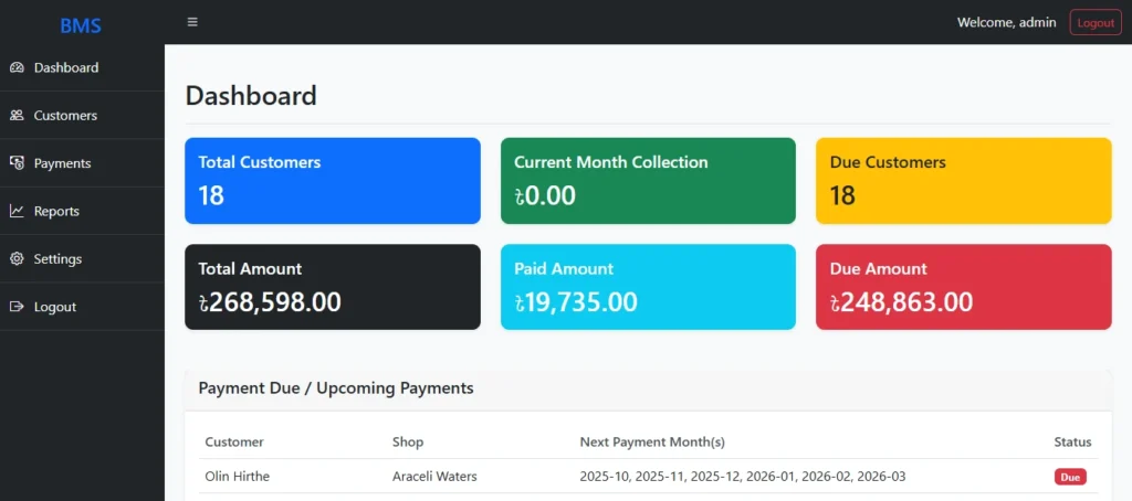 A bill collection web app with customer management, due tracking, payment collection, and detailed reporting for efficient billing operations.