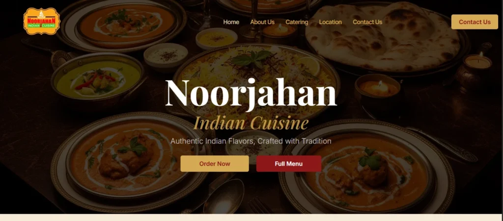 Crafted to showcase authentic Indian flavors, this elegant restaurant website features a signature dish menu, catering services, online ordering, and a warm cultural dining experience.